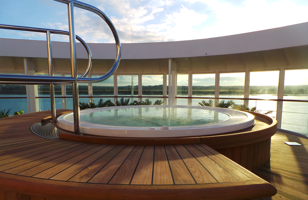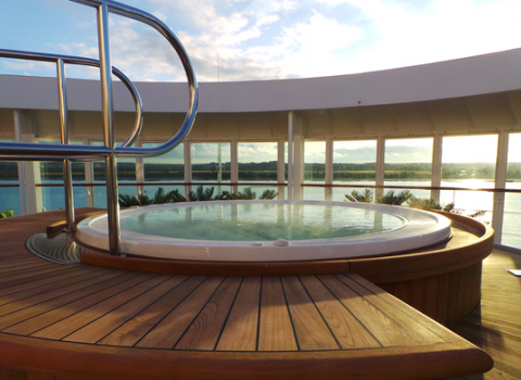 Fully air-conditioned suites enjoy a separate bedroom with two lower beds convertible to king-size bed. Bathrooms boast a whirlpool bath, shower and WC plus luxurious premier pamper pack, bathrobe & slippers. Additionally there is a useful walk-in dressing area with iron & ironing board, trouser press and a hairdryer. The lounge has a sofa & armchairs plus dining table and chairs, with a mini stereo and two flat panel, interactive TVs plus radio and telephone, writing desk, refrigerator and tea/coffee making facilities. There is also a safe. Floor to ceiling sliding glass doors lead to your balcony with loungers, chairs and table. Suites have a butler service, magazine and newspaper selection, atlas and binoculars, plus fruit bowl, mineral water, flowers, champagne and chocolates on arrival and daily canapés.
