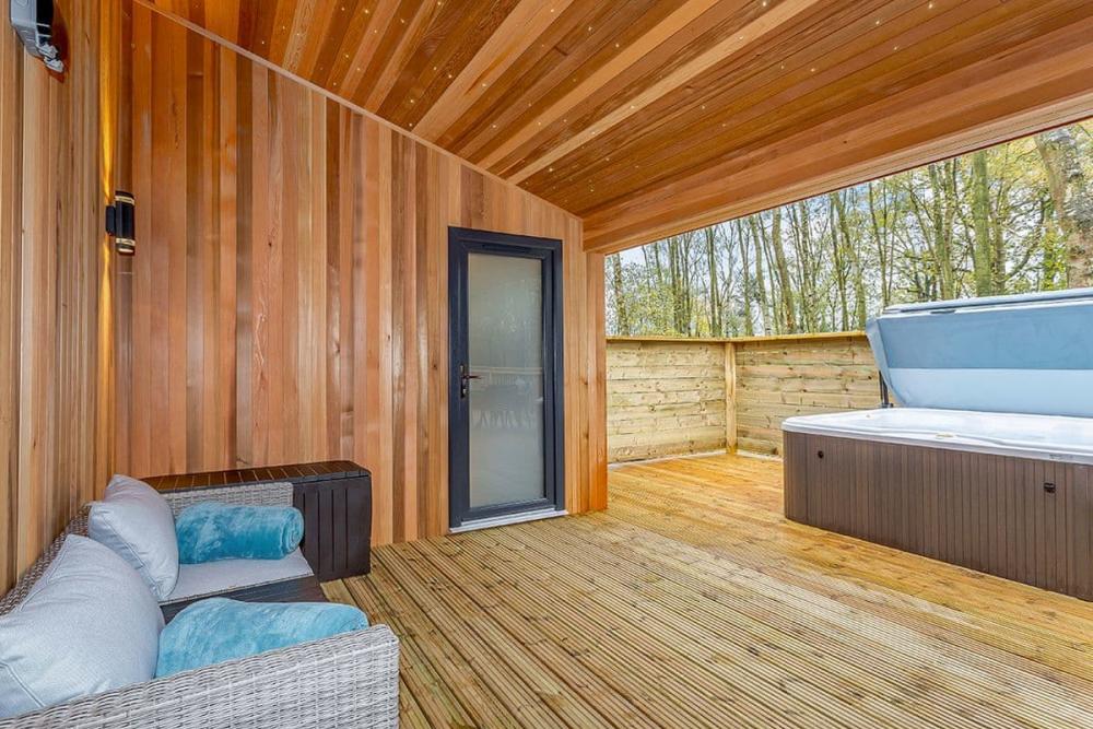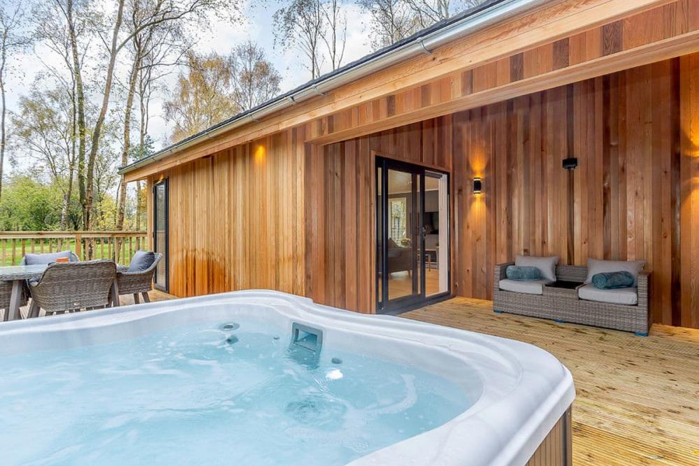 An uber-stylish, adults-only lodge with a private hot tub beside Elton Furze Golf Club—perfect for a romantic long weekend in peaceful woodland.